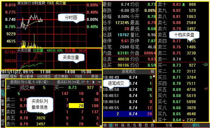 当前全部买入(卖出)委托的总量和加权均价,据此可以判断盘中的支撑位(委买均价)、阻力位(委卖均价)、支撑力度(委买总量)、阻力大小(委卖总量),还可以根据这些数据的动态变化分析多空双方力量的变化,寻找行情的转折点。