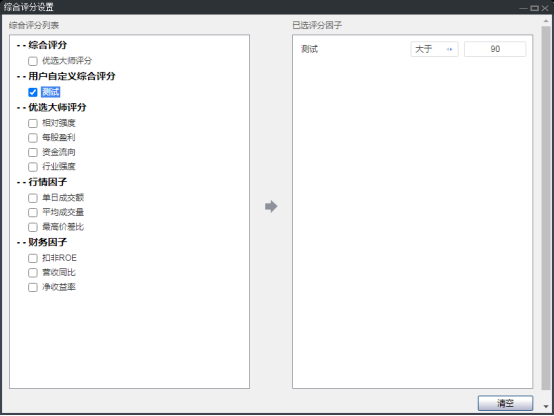 个股评分筛选是个股评分系统功能的补充,用户可在个股评分系统设置自定义评分因子和权重,通过个股评分筛选功能选出符合条件的个股。
